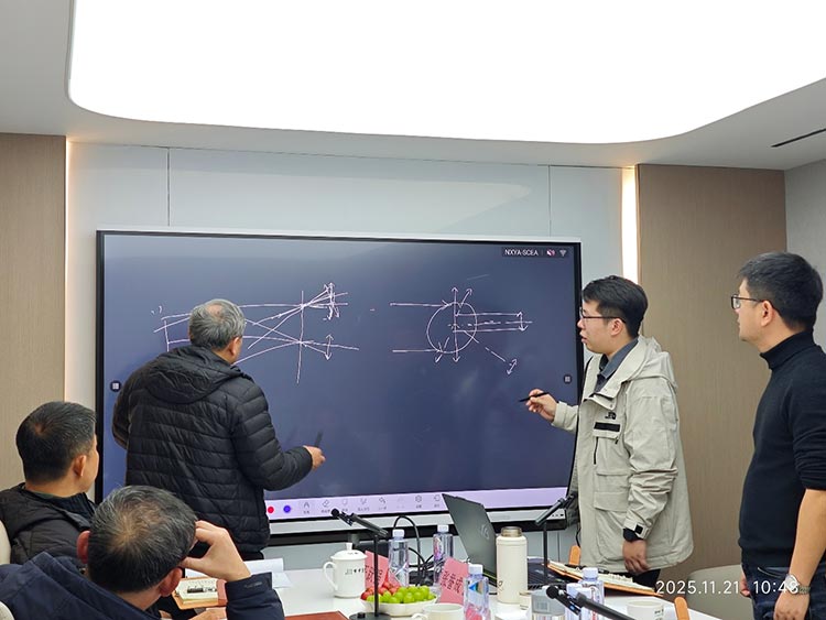 2025年11月21日上午9时许,一场聚焦前沿光学精密设备研发的项目评审会在我司隆重举行。公司特邀中国科学院光电技术研究所的邢廷文、马文礼两位权威光电专家莅临,与宋影松、谢伟民、王跃强三位资深专家共同组成评审专家组,对我司年度重点研发项目展开了系统性的阶段性评审。此次会议不仅是一次对技术路径的深度“校准”,更是融合顶尖外脑智慧、推动项目迈向国际水准的关键一环。