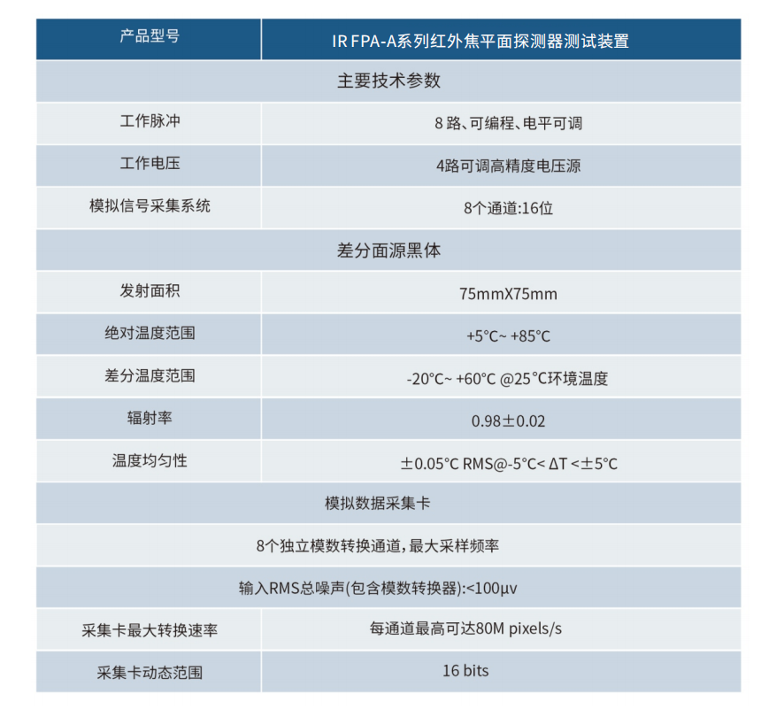IR FPA红外焦平面探测器测试装置可测试探测器像元响应率、响应率不均匀性、噪声电压、探测率噪声等效温差、有效像元率、固定图形噪声、噪声等效功率、饱和辐照功率、动态范围、相对光谱效应读出速率、帧频、串音等性能参数。适用于短波红外/中波红外 /长波红外的各种面阵、线阵,像元中心距 7.5um/10um/12um/15um/25um/30um 的制冷红外焦平面阵列。