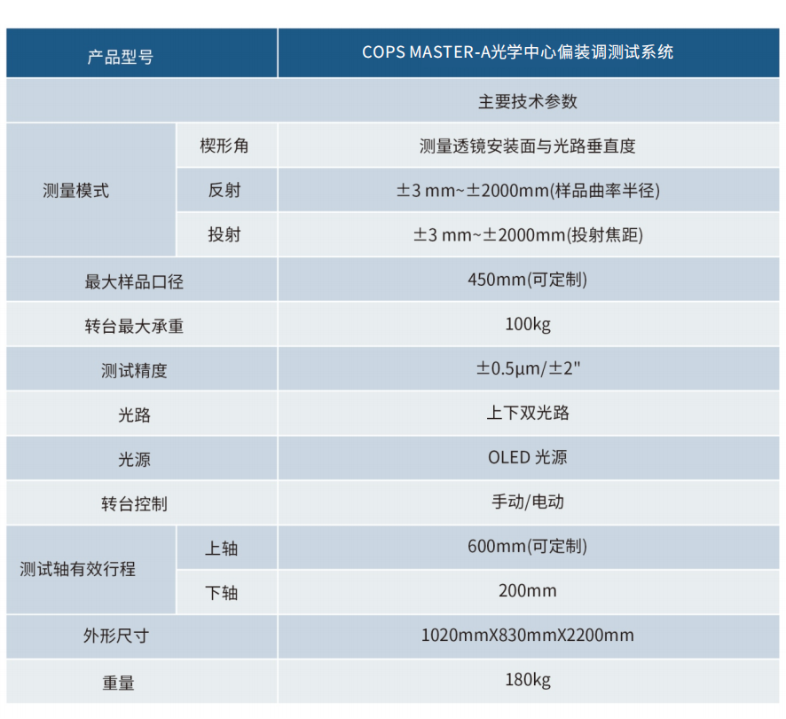 COPS Master光学中心偏装调测试系统是一款测量单透镜与多透镜组中心偏差的高精度测量仪器。该设备具有楔形角、反射、透射和曲率半径测量功能,可用于光学镜片及镜片平行度、同轴度检测,平面光学元件楔形角测量,红外热像仪镜头装备制造和高精度可见光镜头的装配制造过程中。设备具有双光路、气浮式转台、冷光源:人机交互性良好,自动曝光、自动聚焦,一键式测量设备测试数据精确,可靠性高,可实时显示测量结果保存数据、生成测试报告等特点。