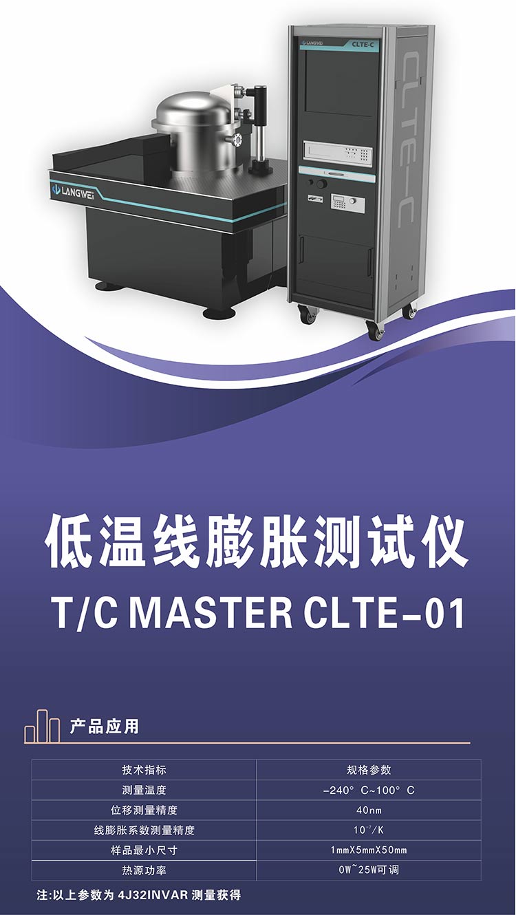T/C MASTER CLTE-01型低温线膨胀系数测量仪是自主国产研发的深低温环境线膨胀系数测量装备。可用于各类型宇航材料线膨胀系数特性测试。该测量仪采用激光干涉测微方法,具备高通量、零膨胀系数(10-7/K) 试样的线胀系数测量能力,测量温度覆盖 -240℃~100℃。